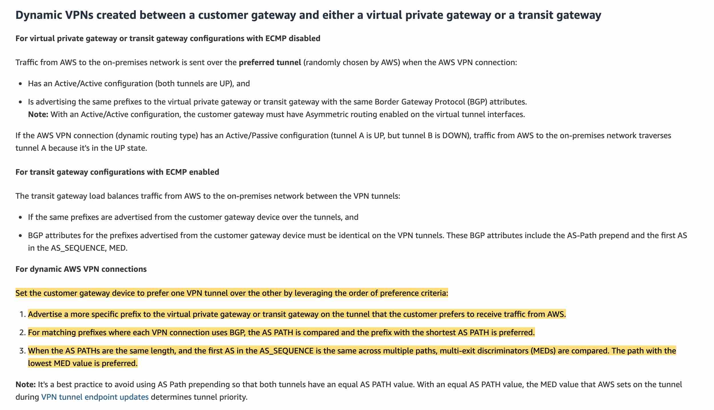 For matching prefixes where each VPN connection uses BGP, the AS PATH is compared and the prefix with the shortest AS PATH is preferred.