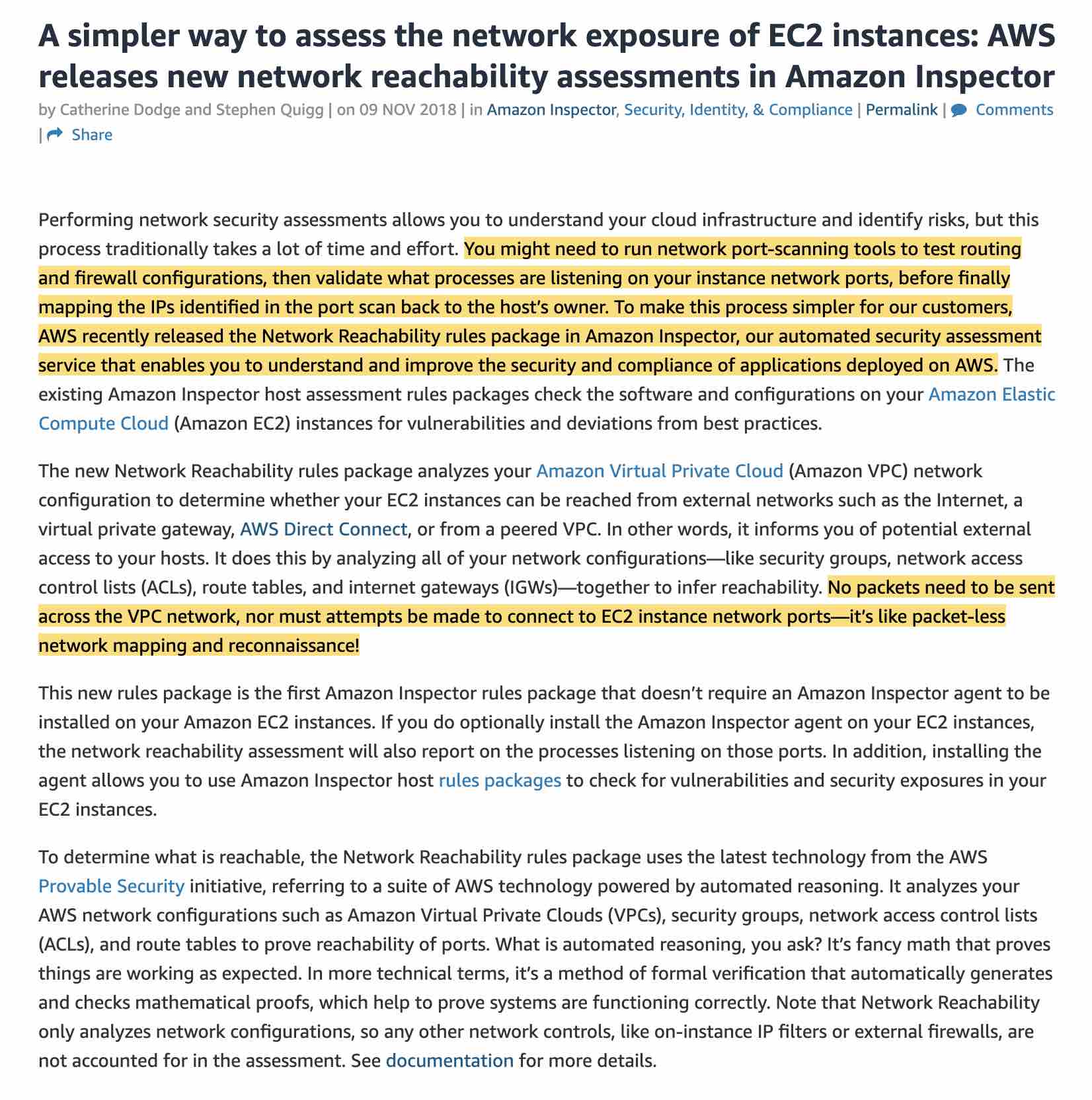 To make this process simpler for its customers, AWS offers the Network Reachability rules package in Amazon Inspector, which is an automated security assessment service that enables you to understand and improve the security and compliance of applications deployed on AWS. The existing Amazon Inspector host assessment rules packages check the software and configurations on your Amazon Elastic Compute Cloud (Amazon EC2) instances for vulnerabilities and deviations from best practices.