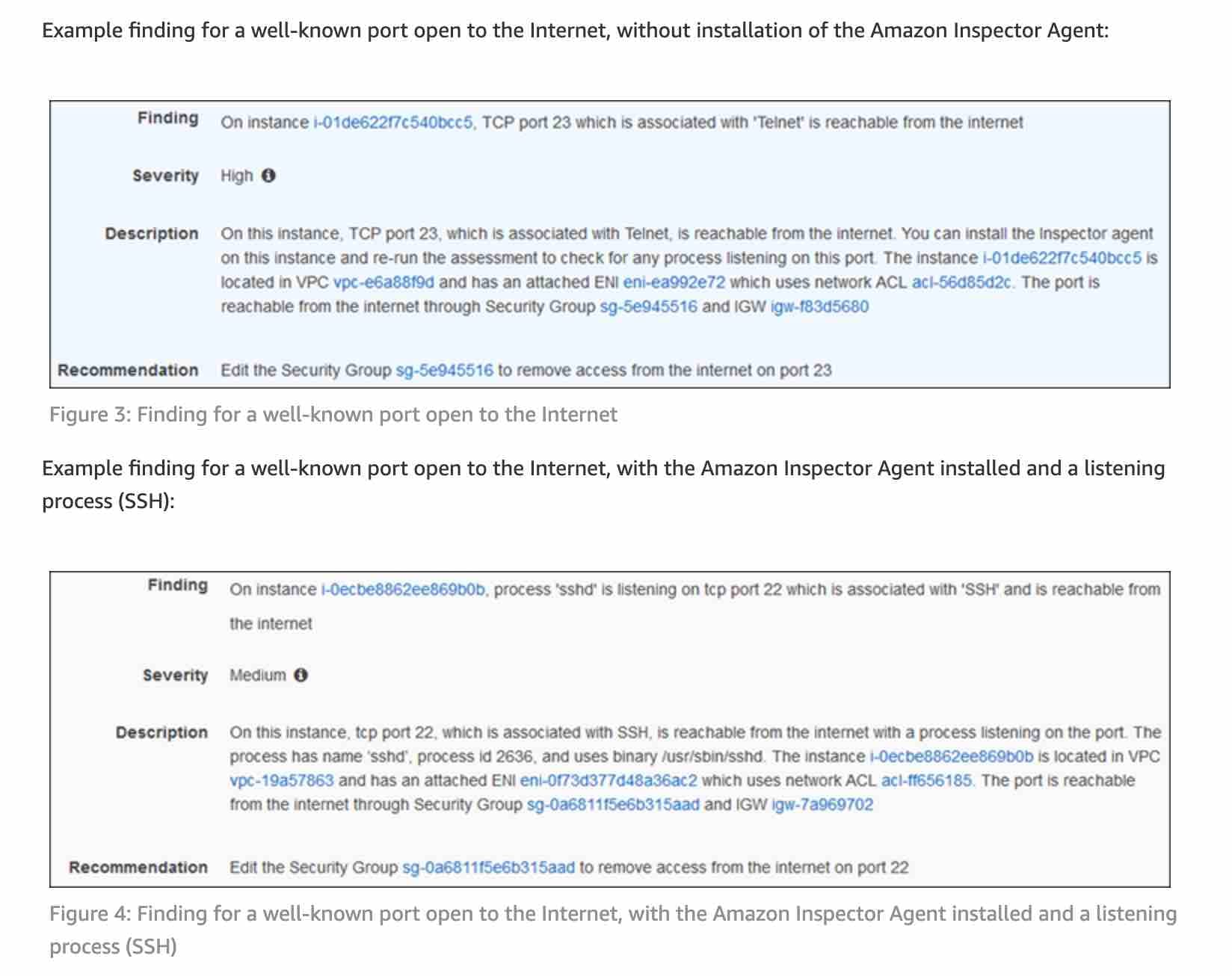 You can use these rules packages to analyze the accessibility of critical ports, as well as all other network ports. For critical ports, Amazon Inspector will show the exposure of each and will offer findings per port. When critical, well-known ports (based on Amazon’s standard guidance) are reachable, findings will be created with higher severities.