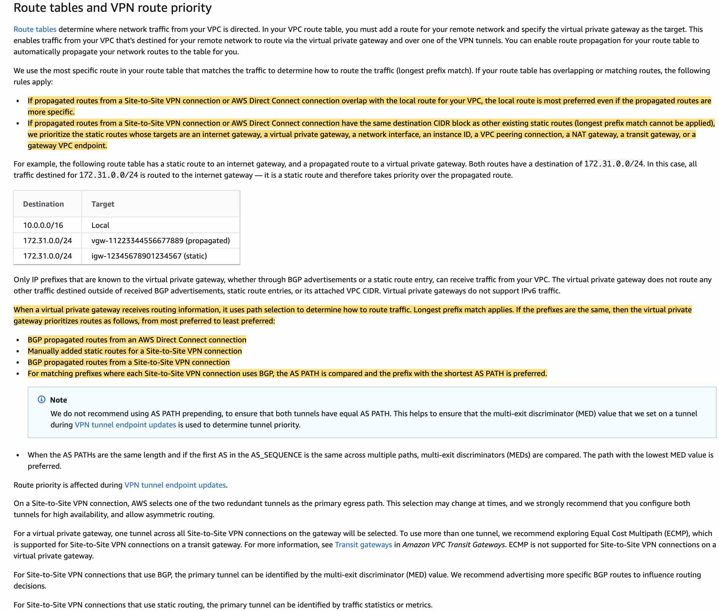 If propagated routes from a Site-to-Site VPN connection or AWS Direct Connect connection have the same destination CIDR block as other existing static routes (longest prefix match cannot be applied), AWS prioritizes the static routes whose targets are an internet gateway, a virtual private gateway, a network interface, an instance ID, a VPC peering connection, a NAT gateway, a transit gateway, or a gateway VPC endpoint.