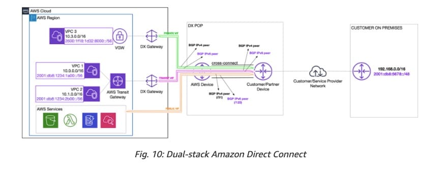 To use your Direct Connect connection for dual-stack traffic, you need to create one of the following virtual interfaces (VIFs): Private VIF, Public VIF, or Transit VIF, or reuse your existing VIFs and enable them for dual-stack support. The following considerations apply to dual-stack VIFs: 1. A virtual interface can support a BGP peering session for IPv4, IPv6, or both (dual-stack). 2. For the IPv6 stack, Amazon automatically assigns a /125 IPv6 CIDR for the BGP peering connection. 3. On Public VIFs, you must advertise to AWS /64 prefixes or larger.