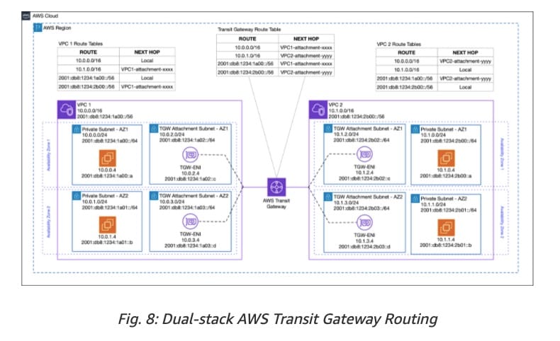 To configure an IPv6-enabled VPC attachment for the Transit Gateway, the VPC and the attachment subnets need to have associated IPv6 CIDRs. The remaining Transit Gateway configurations continue to have the same functionalities across both stacks