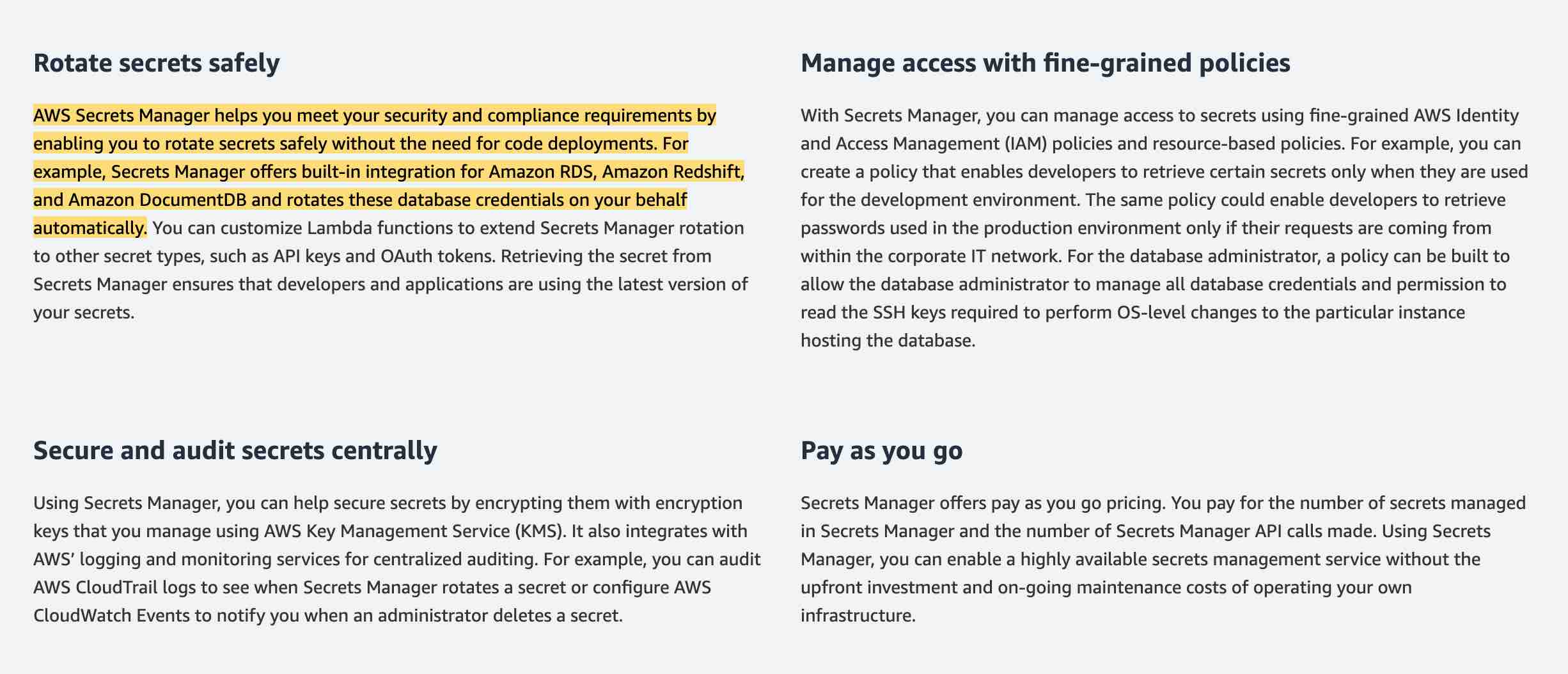 AWS Secrets Manager enables you to easily rotate, manage, and retrieve database credentials, API keys, and other secrets throughout their lifecycle. Users and applications retrieve secrets with a call to Secrets Manager APIs, eliminating the need to hardcode sensitive information in plain text. Secrets Manager offers secret rotation with built-in integration for Amazon RDS, Amazon Redshift, and Amazon DocumentDB.