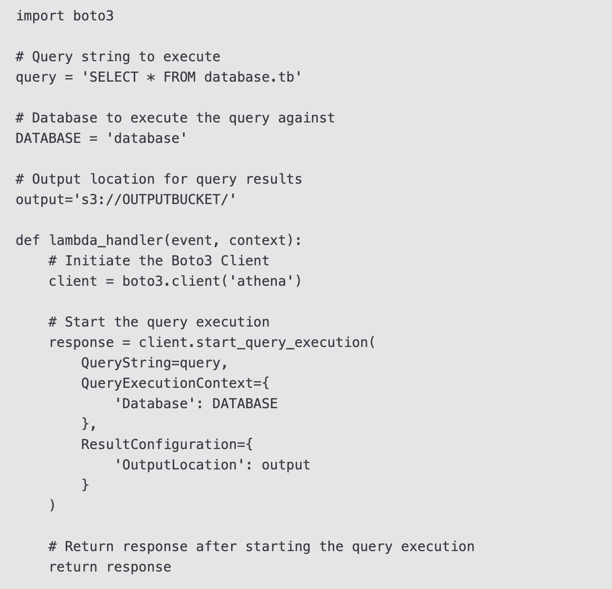 Set up an AWS Lambda function that uses the Athena Boto3 client start_query_execution API call to execute the Athena queries programmatically