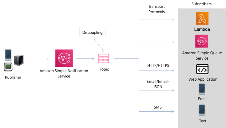 Subscribers (that is, web servers, email addresses, Amazon SQS queues, AWS Lambda functions) consume or receive the message or notification over one of the supported protocols (that is, Amazon SQS, HTTP/S, email, SMS, Lambda) when they are subscribed to the topic.