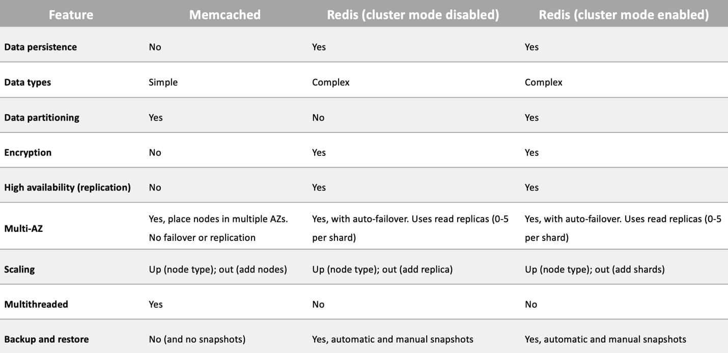You can see the differences between the different engines and configuration options for ElastiCache in the table below: