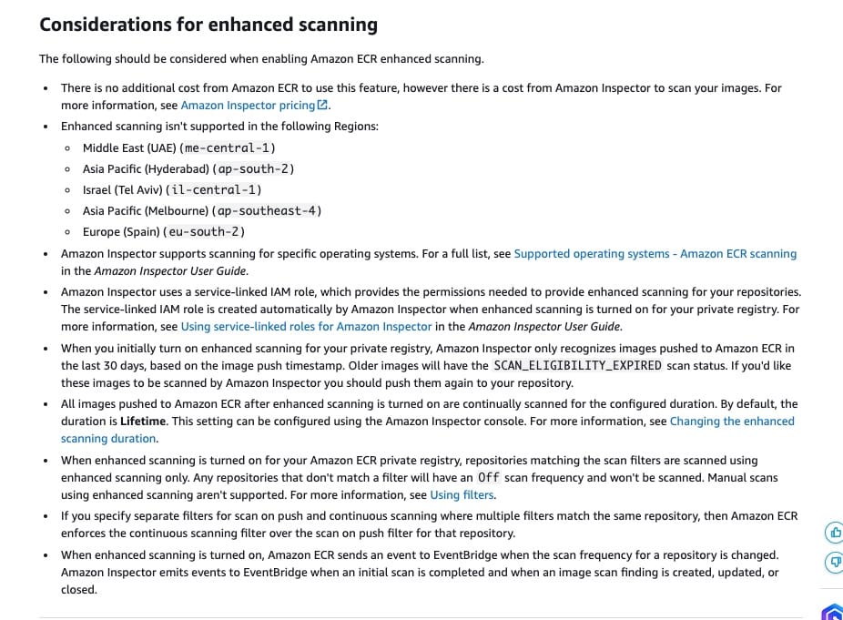via - https://docs.aws.amazon.com/AmazonECR/latest/userguide/image-scanning-enhanced.html