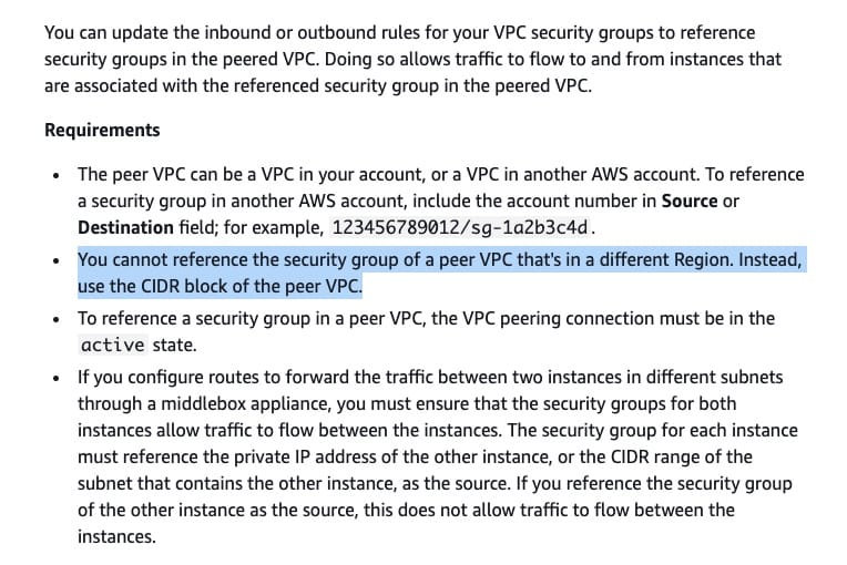 You cannot reference the security group of a peer VPC that's in a different AWS Region. Instead, use the CIDR block of the peer VPC.