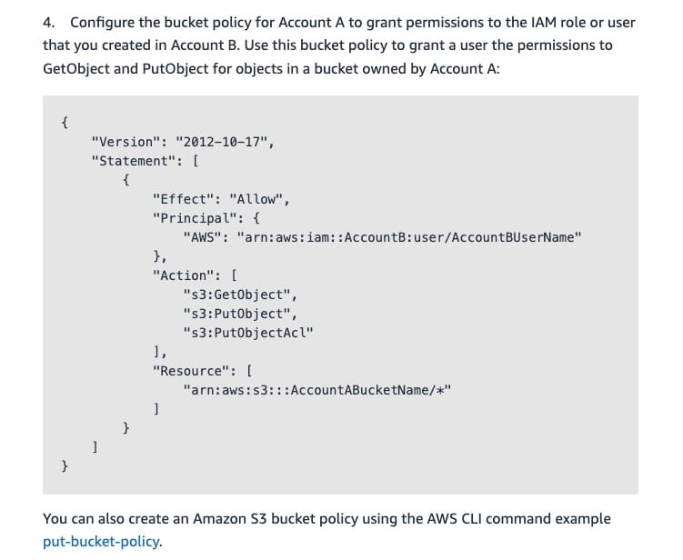 Following is an example bucket policy for Account A to grant permissions to the IAM role or user that you created in Account B. Use this bucket policy to grant a user the permissions to GetObject and PutObject for objects in a bucket owned by Account A.