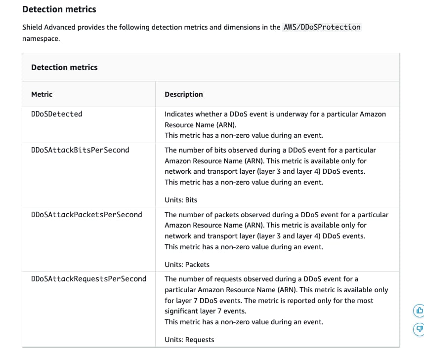 AWS Shield Advanced provides a few detection metrics and dimensions in the AWS/DDoSProtection namespace. DDoSDetected metric indicates whether a DDoS event is underway for a particular Amazon Resource Name (ARN). This metric has a non-zero value during an event.