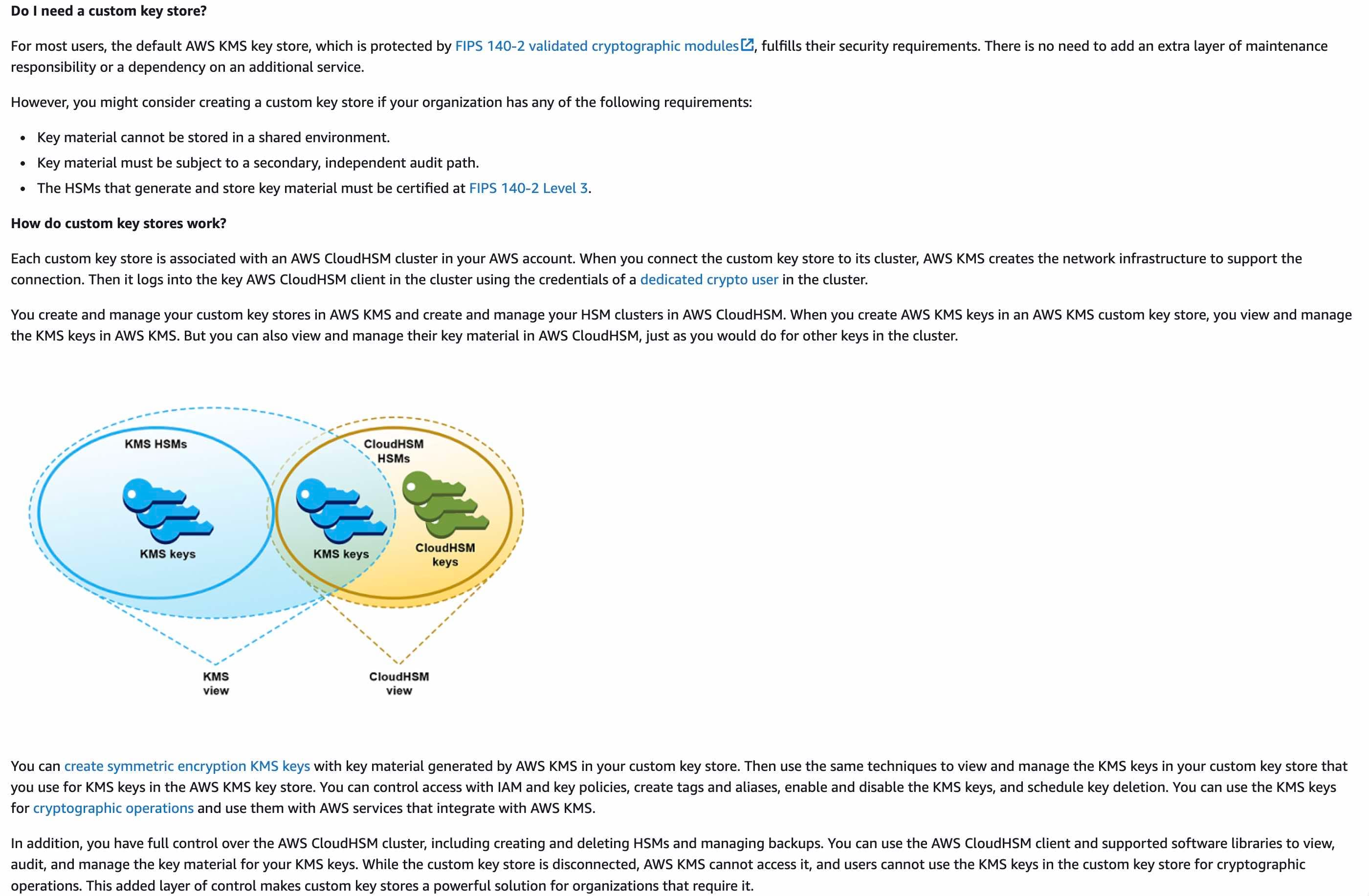 A key store is a secure location for storing cryptographic keys. The default key store in AWS KMS also supports methods for generating and managing the keys that its stores. By default, the cryptographic key material for the AWS KMS keys that you create in AWS KMS is generated in and protected by hardware security modules (HSMs) that are FIPS 140-2 validated cryptographic modules. A custom key store is a logical key store within AWS KMS that is backed by a key manager outside of AWS KMS that you own and manage.