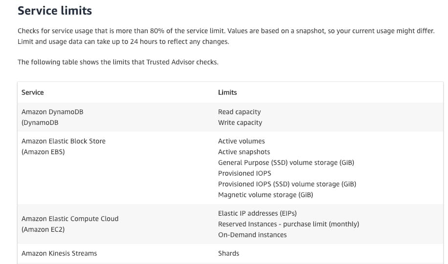 Monitor Trusted Advisor service check results with Amazon CloudWatch Events - AWS Trusted Advisor checks for service usage that is more than 80% of the service limit.