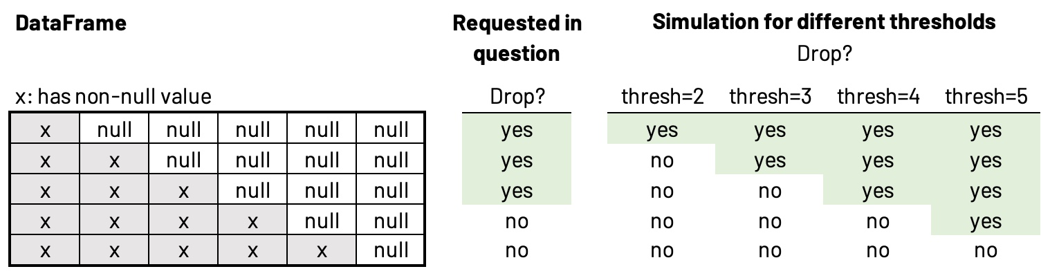 Correct. Note that by only working with the thresh keyword argument, the first how keyword argument is ignored. Also, figuring out which value to set for thresh can be difficult, especially when under pressure in the exam. Here, I recommend you use the notes to create a "simulation" of what different values for thresh would do to a DataFrame. Here is an explanatory image why thresh=4 is the correct answer to the question: