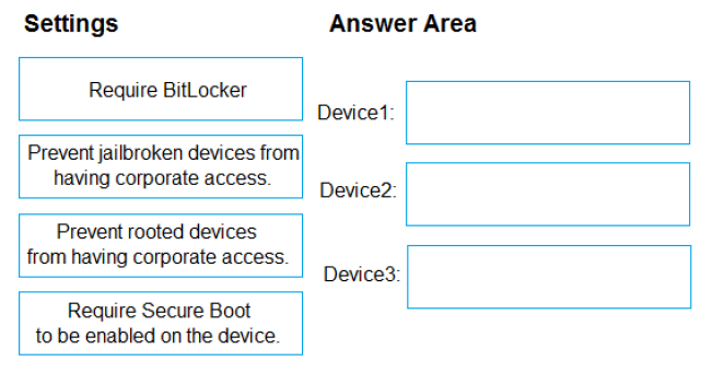 Which compliance policy setting should you configure for each device? To answer, drag the appropriate settings to the correct devices. Each
