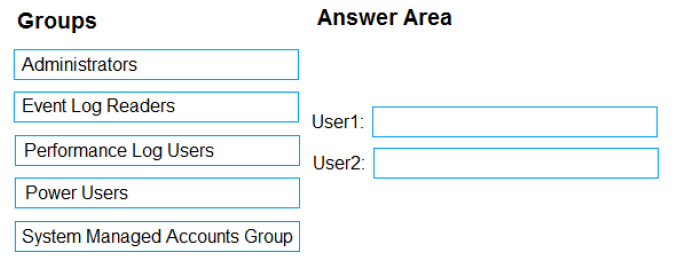 To which group should you add each user? To answer, drag the appropriate groups to the correct users. Each group may be used once, more than