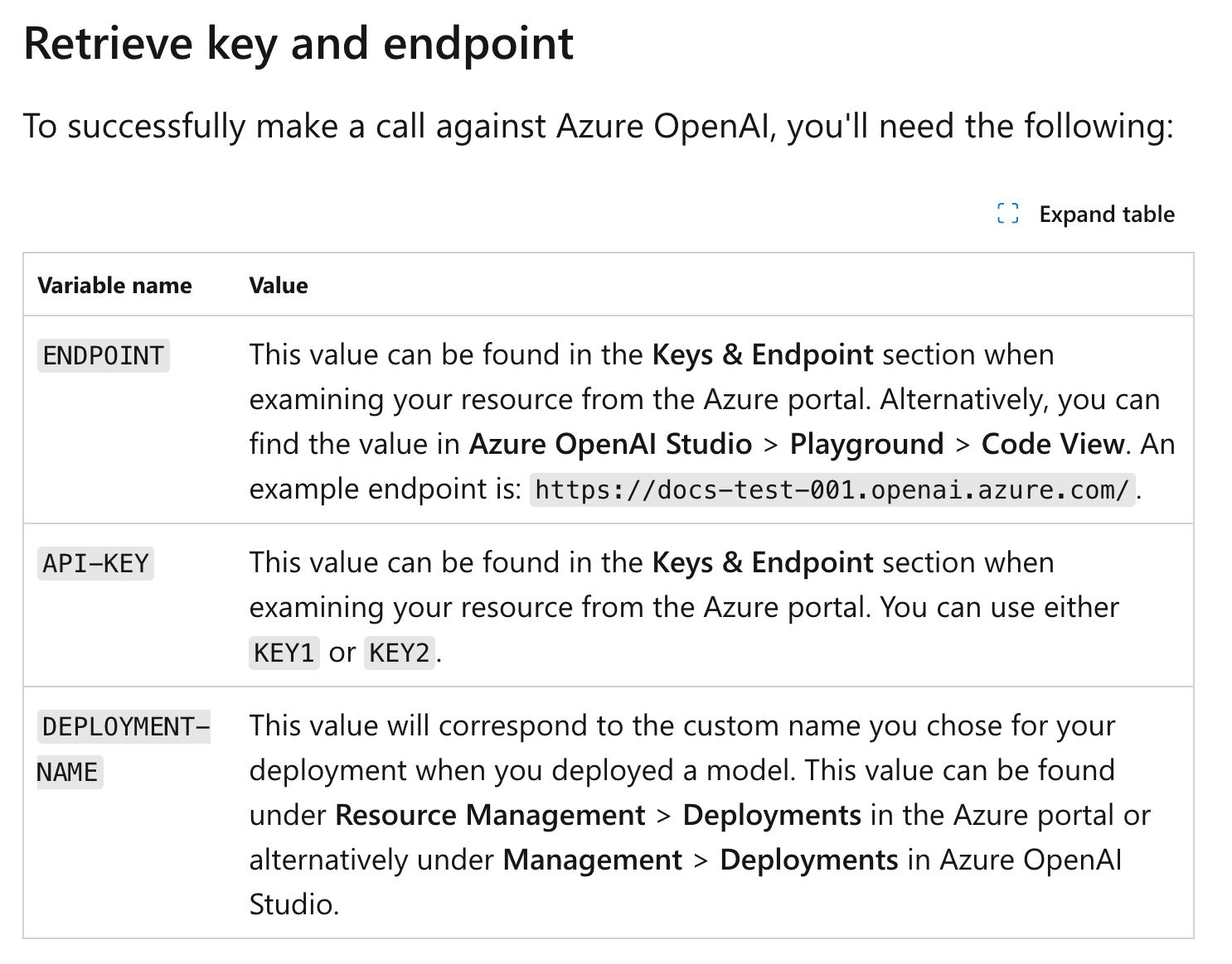 Deployment name: This specifies which deployment of the model you want to use. In Azure OpenAI, you might have multiple deployments of the same model optimized for different tasks.