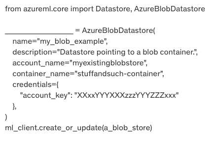 You are tasked with creating a datastore in Azure Machine Learning using Python SDK. Fill in the blank in the following Python SDK code block that correctly instantiates an Azure Blob Datastore: