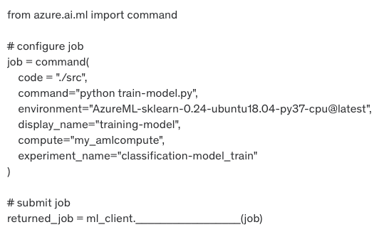 Consider this Python SDK code snippet used to configure and run a script as a command job in Azure Machine Learning. Complete the blank in the code to correctly submit the job using the ml_client object.