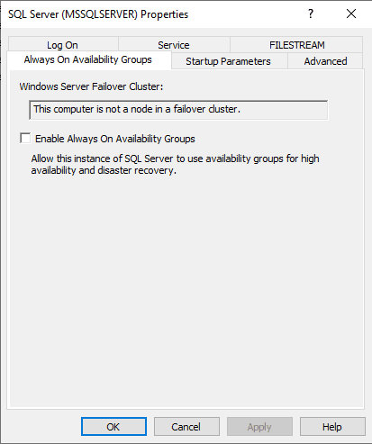 Before an AG can be configured, the AG feature must be enabled. This can be done in SQL Server Configuration Manager as shown in the image below or via PowerShell with the cmdlet Enable-SqlAlwaysOn. Enabling the AG feature will require a stop and start of the SQL Server service.