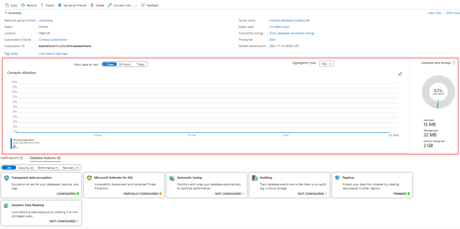 You can monitor database resources utilization through Azure portal. This feature allows you to easily identify how the database is performing, as shown in the image below: