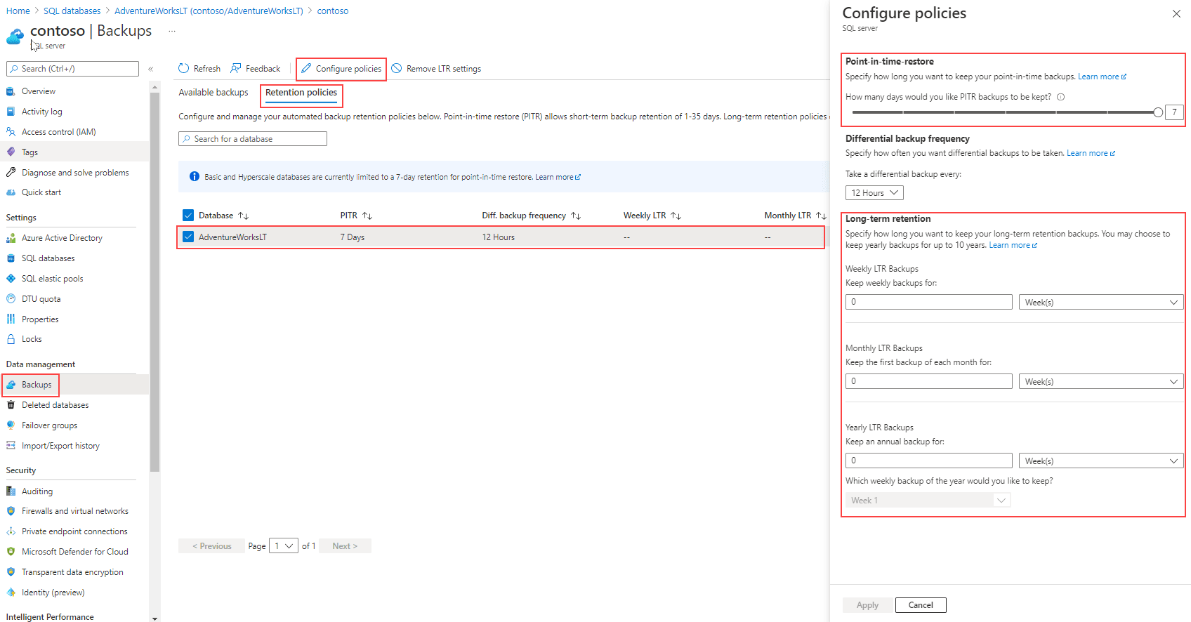In the image above, you can configure long-term retention policies through Azure portal. Once the database is selected, a new panel will open on the right side of the screen, where you can override the default properties.