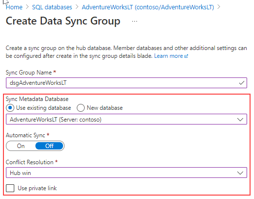 In the image above, you can specify sync group properties like the schedule synchronization, the conflict resolution option, and the use of a private link if needed.