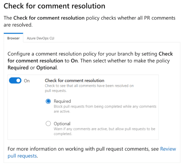 You need to ensure that all comments on pull requests are resolved before the pull requests are included in a build. The solution must minimize administrative effort.
