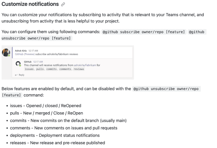 https://github.com/integrations/microsoft-teams#customize-notifications