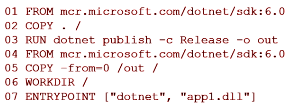 You have a Dockerfile file that contains the following code. (Line numbers are included for reference only.)