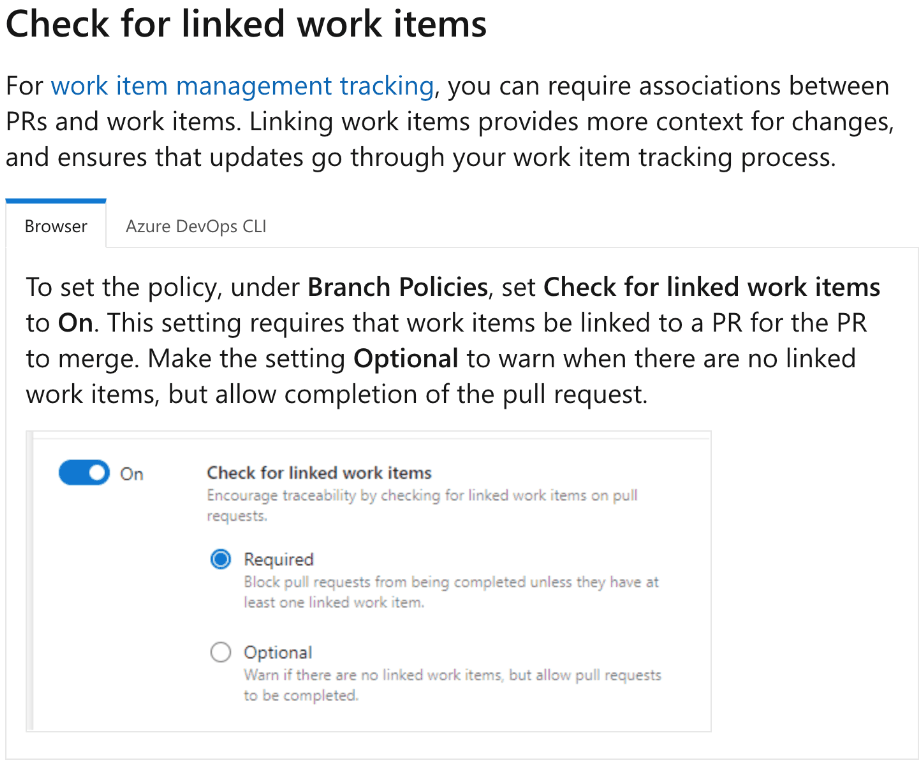 Branch is CORRECT because the branch policy in Azure Repos allows you to enforce work item linking as a part of the pull request process. By setting up a branch policy, you can require that all pull requests to a specified branch are associated with a work item, ensuring that changes are tracked against tasks, bugs, or other work items. This approach minimizes administrative effort as it automates the enforcement of this requirement and integrates smoothly with the workflow in Azure DevOps.