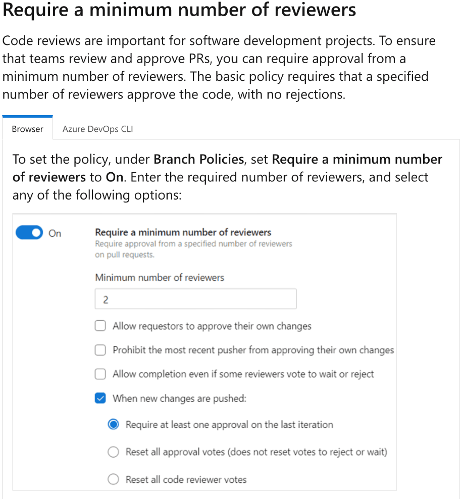 Branch is CORRECT because branch policies in Azure Repos can be used to enforce rules for pull requests, including the requirement for a minimum number of reviewers. By setting up a branch policy for Repo1, you can specify that all pull requests targeting the branch require at least two reviewers. This ensures code quality and adherence to team practices with minimal administrative effort, as the policy automatically applies to all relevant pull requests.