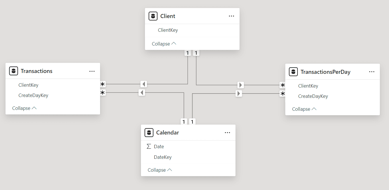Similar to the Calendar table, the Client table has occasional updates. Dual mode provides a balance between performance and data freshness.