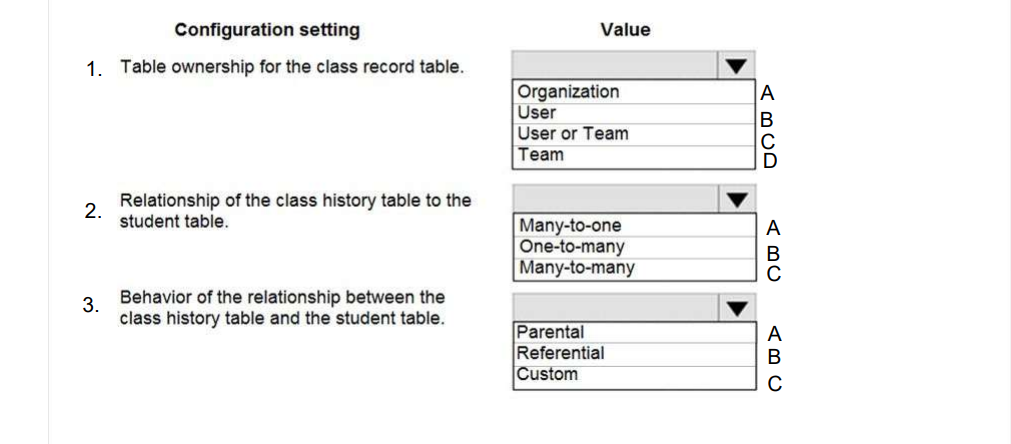 A school district wants to standardize student information and student performance records. Students in the district are assigned to a specific school. Students are evaluated using class records. When students move between schools in the middle of a school year, the student's current class history must be available to the administrators at the new school. You need to configure Microsoft Dataverse tables to connect the class history records to their respective class records.