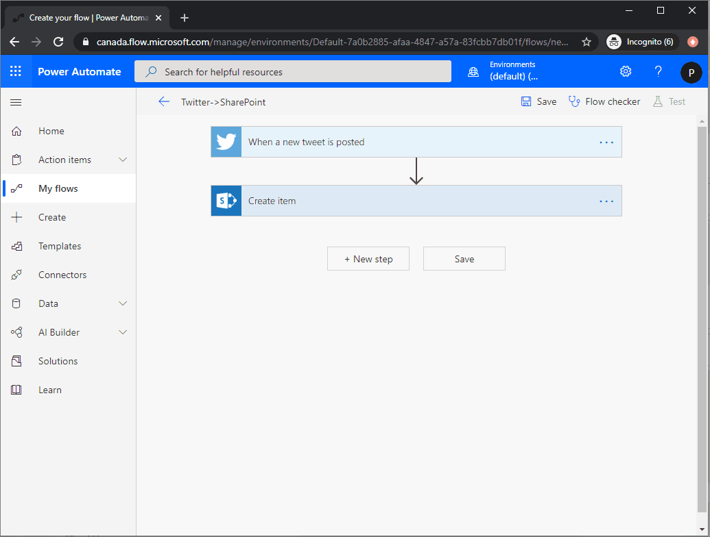 To test your flow, sign in to the Power Automate maker portal by using a different account. Now, you will create a simple flow that includes a SharePoint trigger and a Twitter action. This scenario will not be blocked by your DLP policy, but it should be detected by the administrative flow that you created.