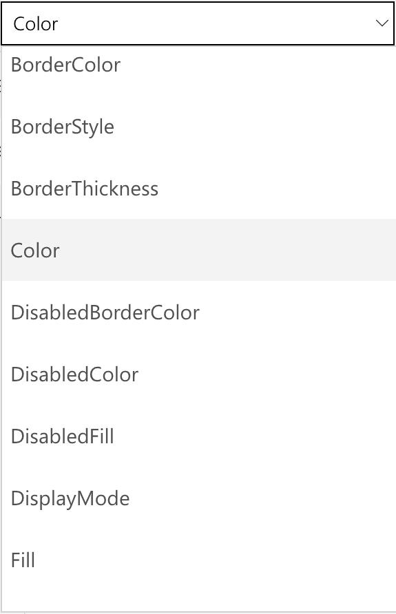 If you select a control and then open the property drop-down list, a list of properties that are relevant to the control appears. For example, the following is a partial list of the properties for a Label control. Some properties are relevant across a wide range of controls, but others are relevant only for a specific control.