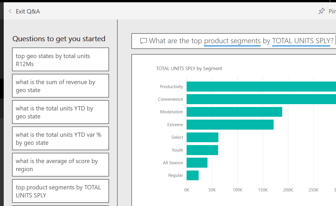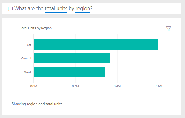 Ask a question about your data in Q&A by using natural language. Natural language refers to the ordinary language that humans use to communicate with one another every day. An example would be, “What are the total units by region?”