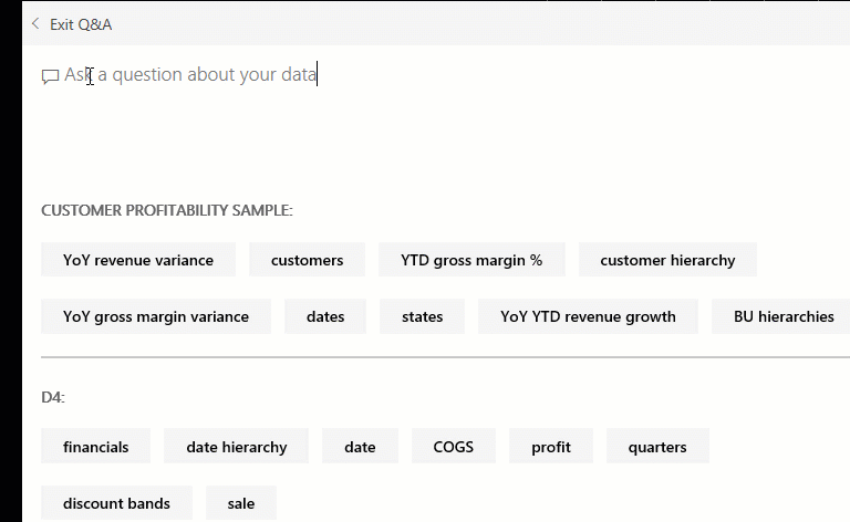 You can use Q&A to explore your data by using the intuitive, natural language capabilities of Power BI and receive answers in the form of charts and graphs.