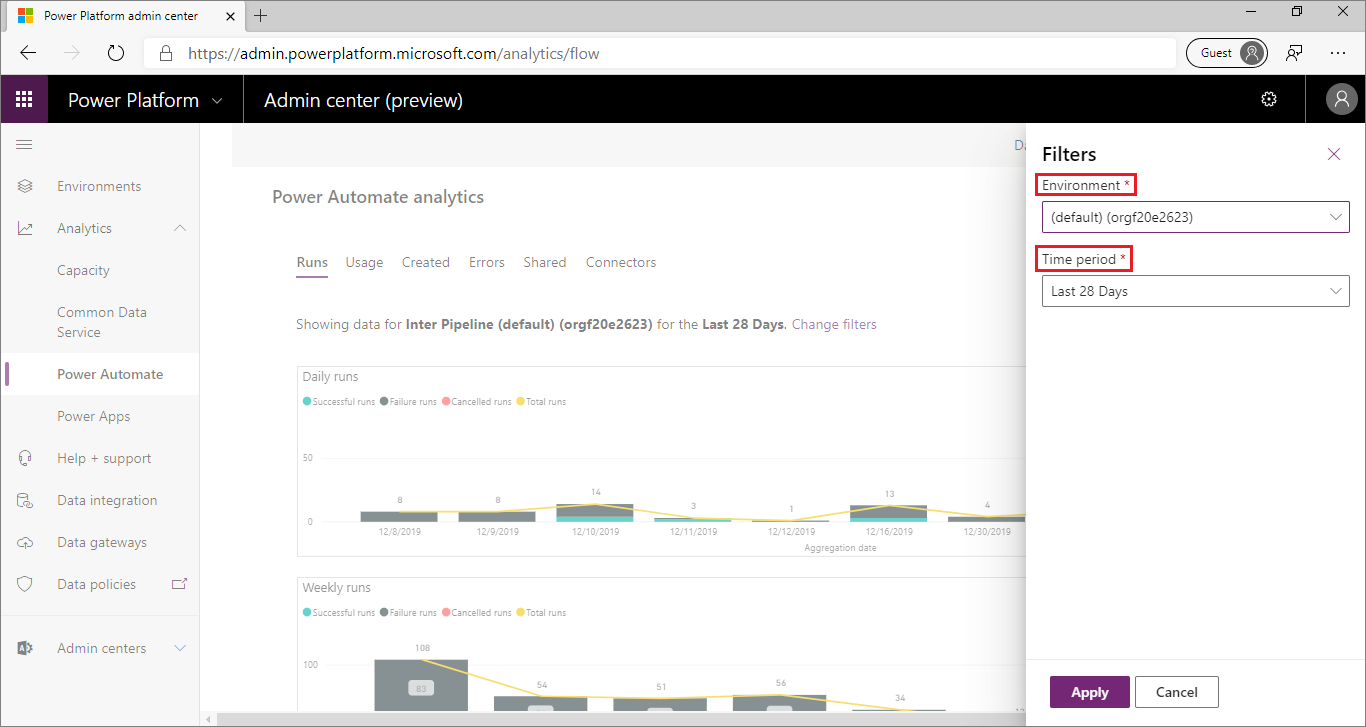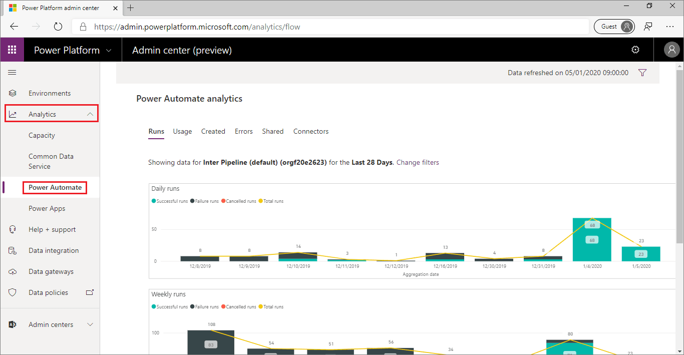 Within the Runs report in the Power Automate Analytics feature, administrators will be able to determine the number of flow runs within that environment for each day, week, and month. In addition, Power BI embedded slicers allow an administrator to filter data based on whether the run was successful, failed, or cancelled.