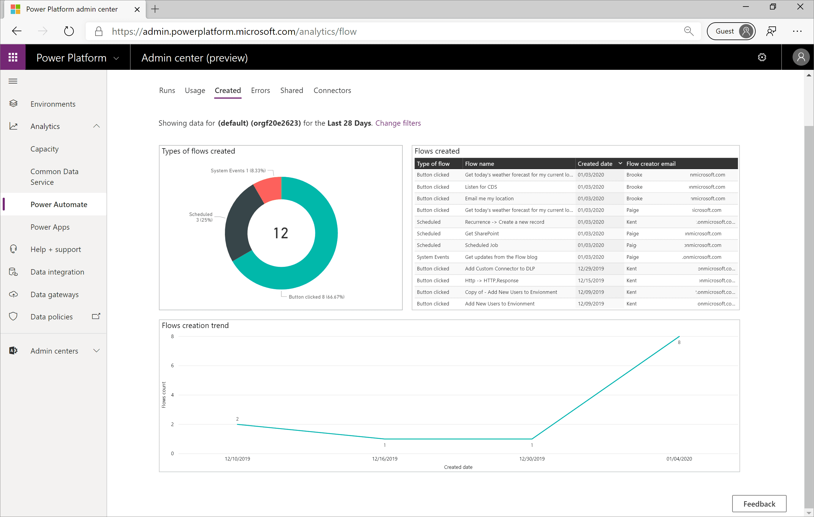 The Created report is useful for people who are responsible for change management. Perhaps the organization has recently provided Power Automate training and wants to see if people are putting these new skills to use.