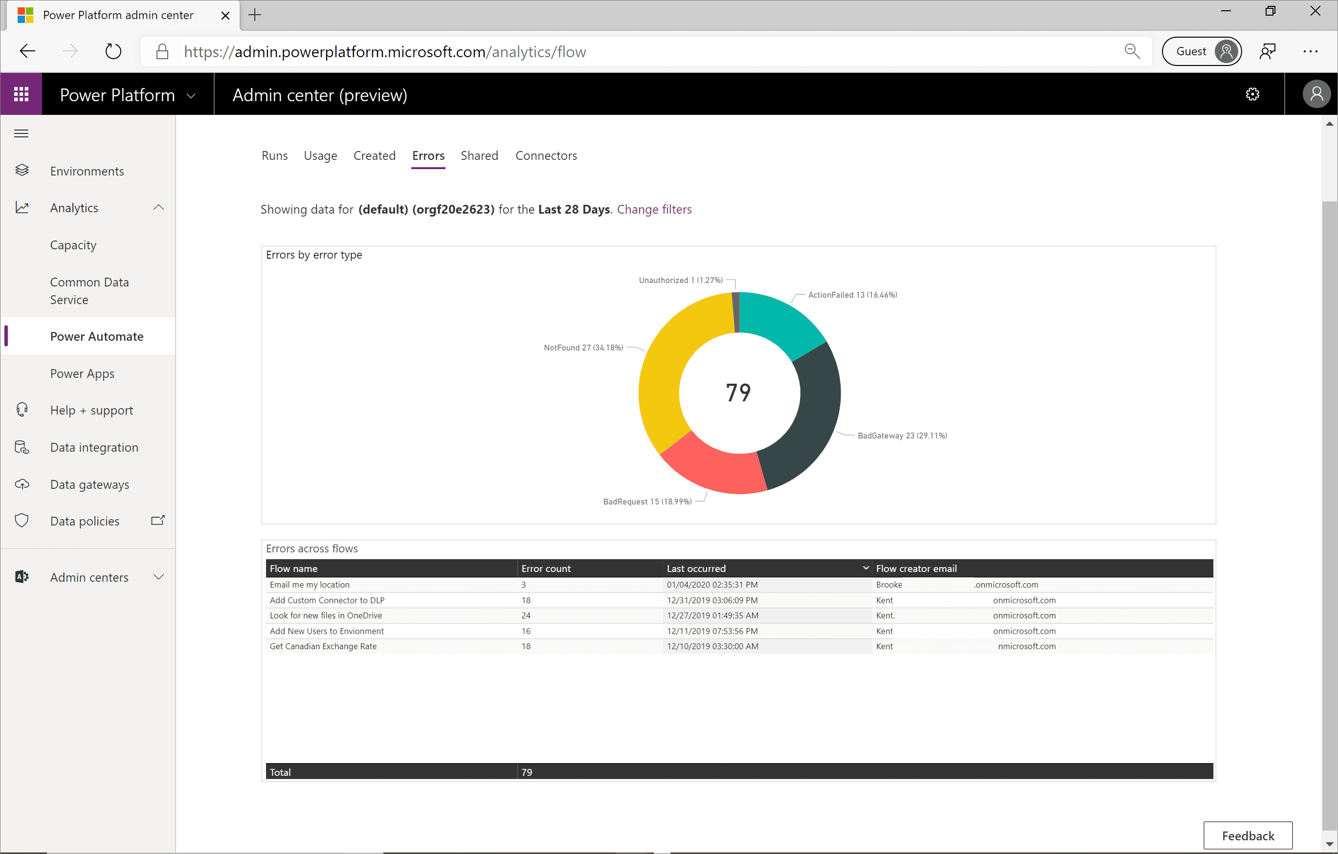 For administrators, detecting when makers are experiencing errors with their flows can become a great concern if a flow continues to fail and supports an important business process. The Errors report will help administrators identify flows that are failing and will display the Error count, the Last occurred timestamp, and the Flow creator email information. In addition, a pie chart will break down the error types that will highlight the different types of errors that makers have been experiencing.