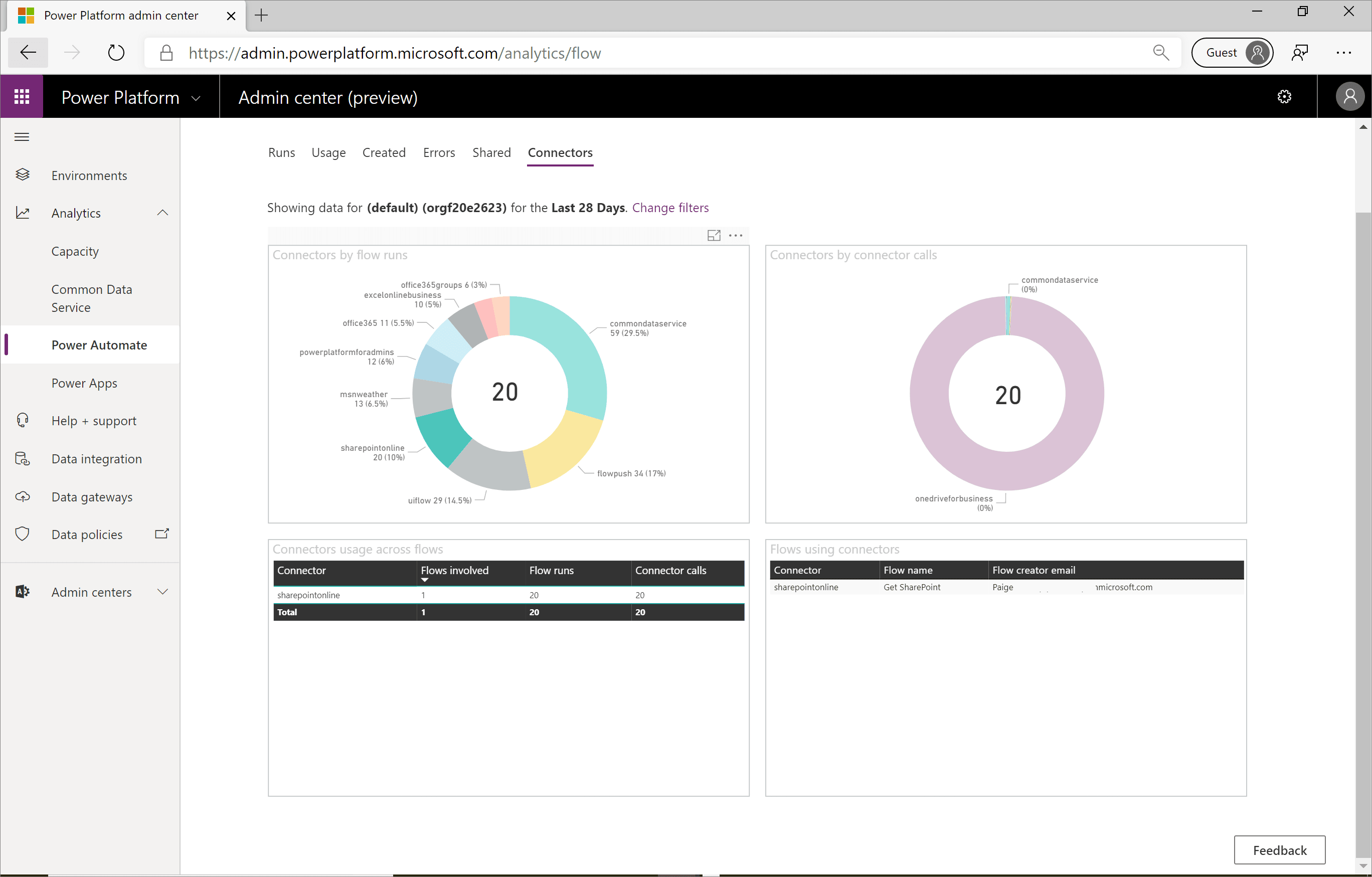 For example, consider a situation where an administrator wants to make a DLP connector change that involves the SharePoint connector. The administrator can select the SharePointOnline connector from the Connectors by flow runs visualization. As a result, the Connectors by connector calls visualization will be updated. In addition, you will see an updated table called Flows using connectors. In this visualization, you will see all flows that use the SharePoint connector and the Flow creator email address. This information will help you identify all makers that you should proactively reach out to before making any DLP changes.
