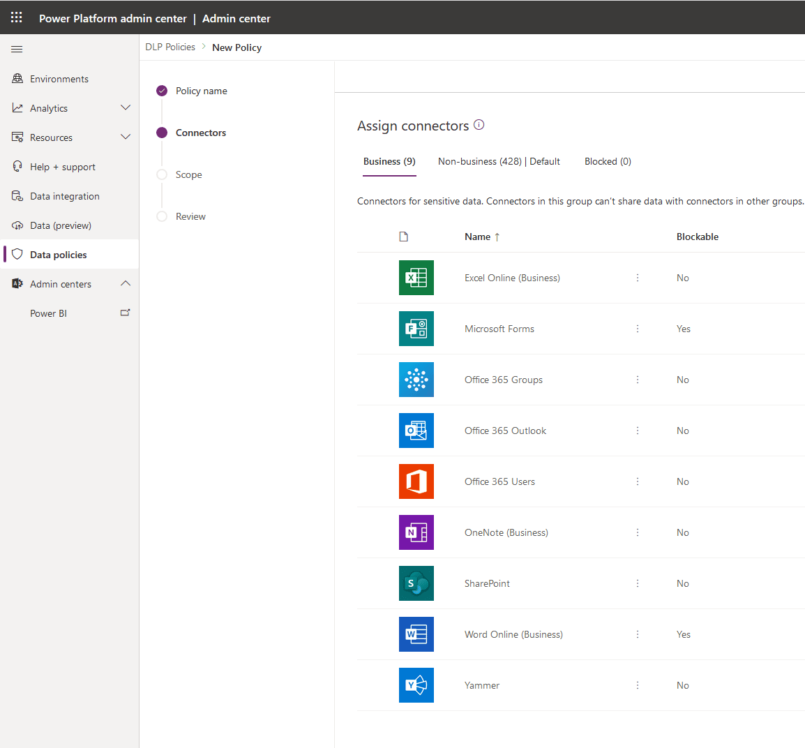 DLP Business and Non-business data groups can be used to separate connectors that share similar characteristics when it comes to their applicability to the business. For flows and apps that are processing business-related data, you will want to ensure that these connectors are placed within the Business data group. When you have connectors that don't support valid business use cases, these connectors are best placed in the Non-business data group.