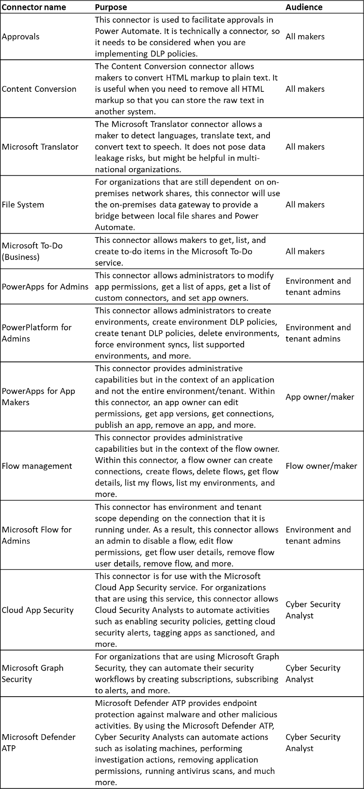 While the preceding connectors represent connectors that are related to Office 365 services, other connectors exist that administrators should consider including, even though they are not related to Office 365.