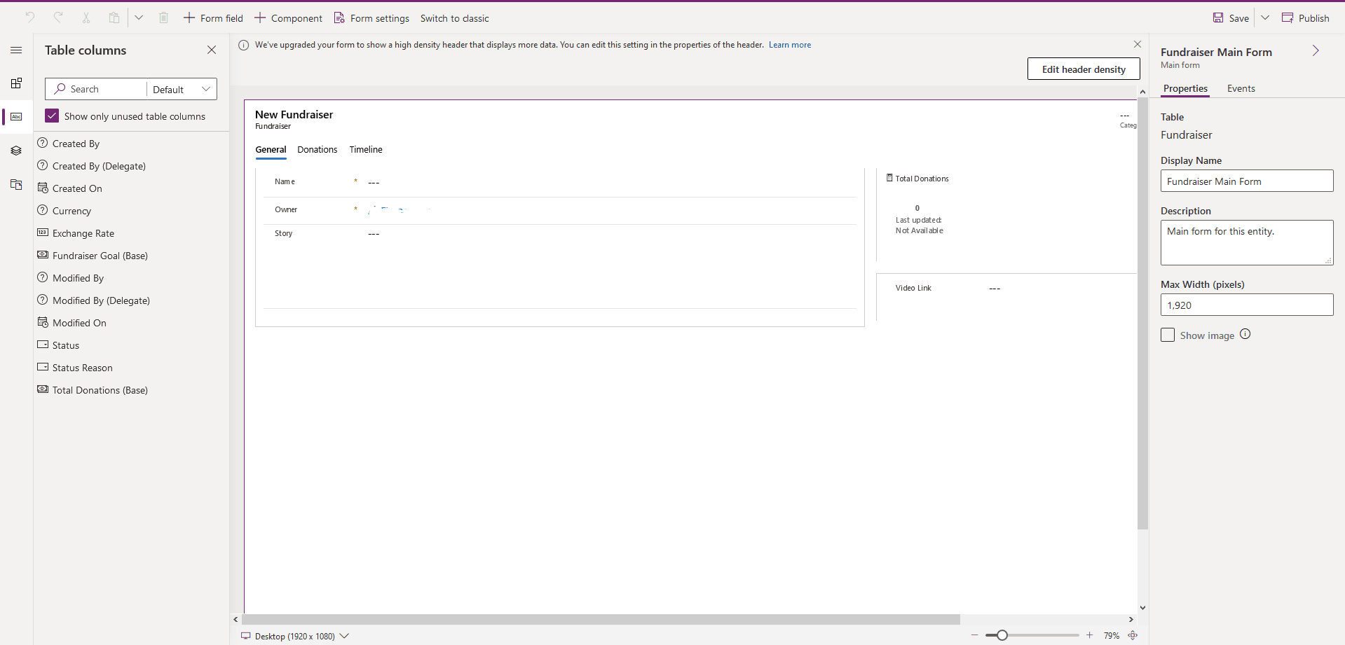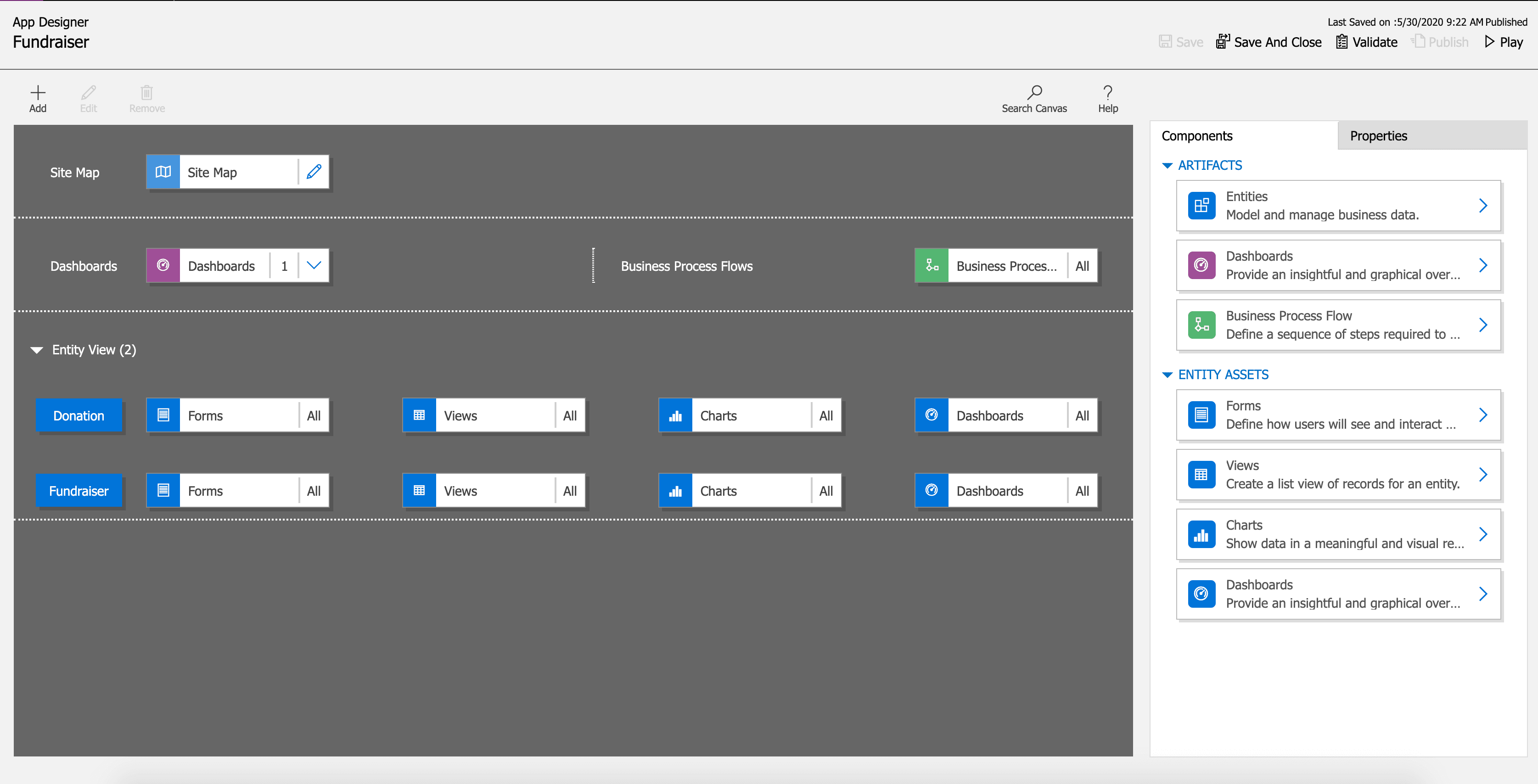 Here is a quick look at the App Designer for an example Model-driven app called “Fundraiser.”