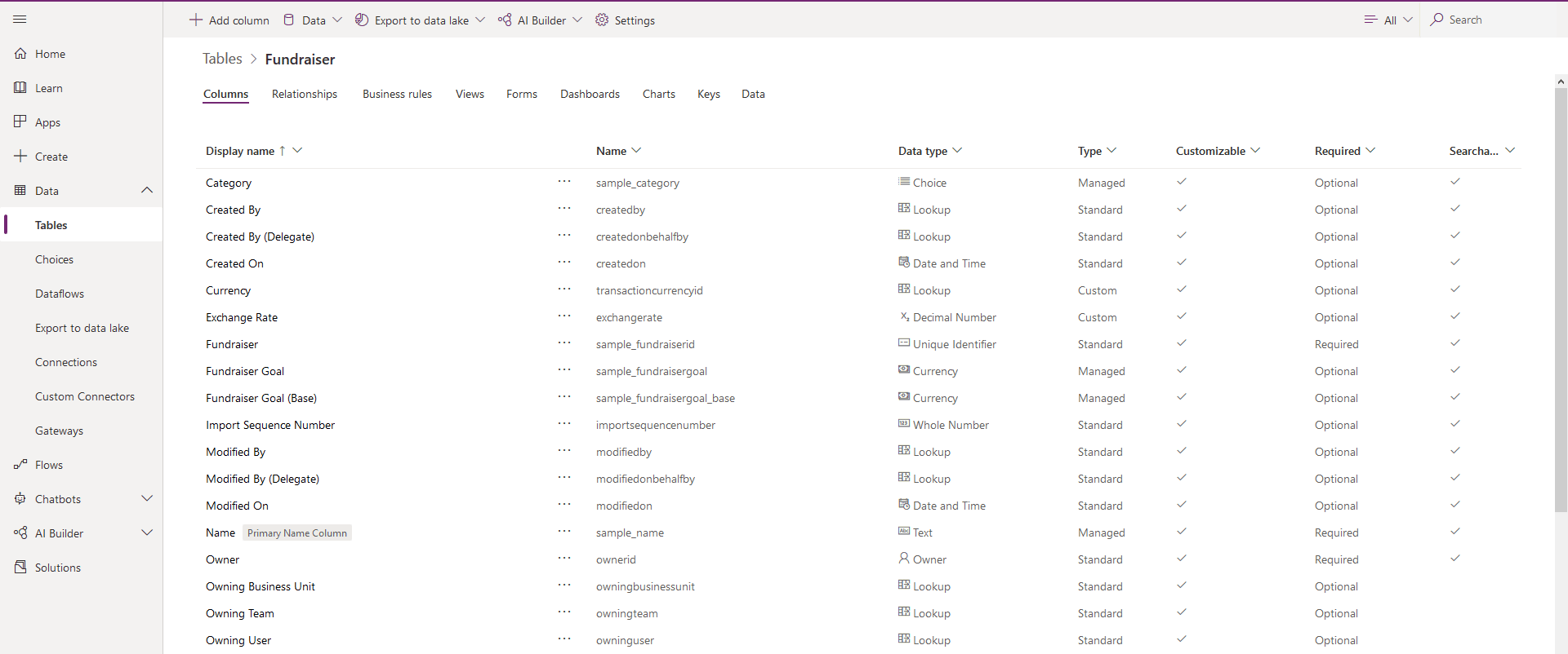 In the example above, for the Fundraiser table, there are several pieces of metadata being collected, such as: