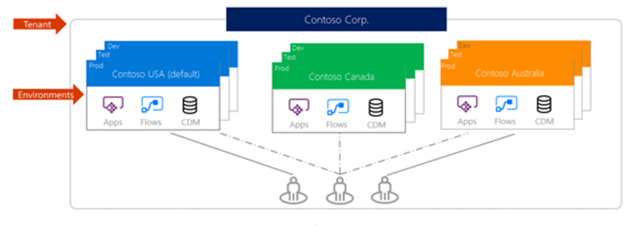 Each environment is created under a Microsoft Azure Active Directory (Azure AD) tenant, and its resources can only be accessed by users within that tenant. An environment is also bound to a geographic location, like the United States. When you create a Microsoft Dataverse database in an environment, that database is created within datacentres in that geographic location. Any items that you create in that environment (including connections, gateways, flows that are using Power Automate, and more) are also bound to their environment's location.