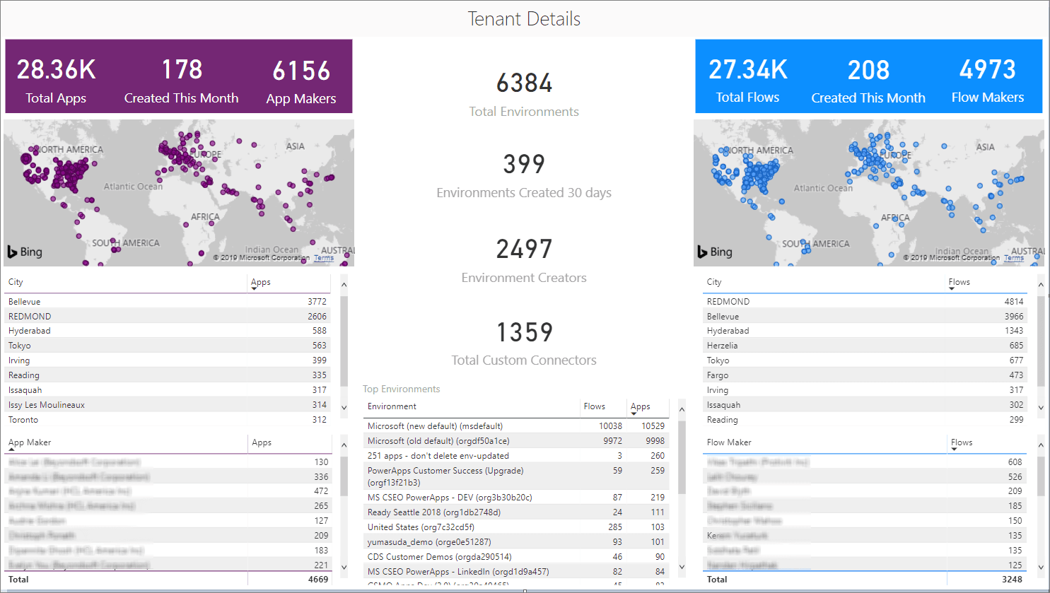 Overview - Includes the total number of apps and flows that have been created, including a breakdown based on the maker's location and the number of apps/flows that they have created.
