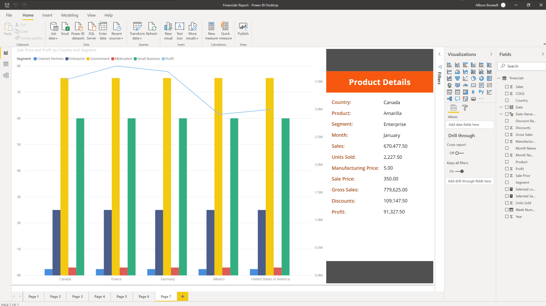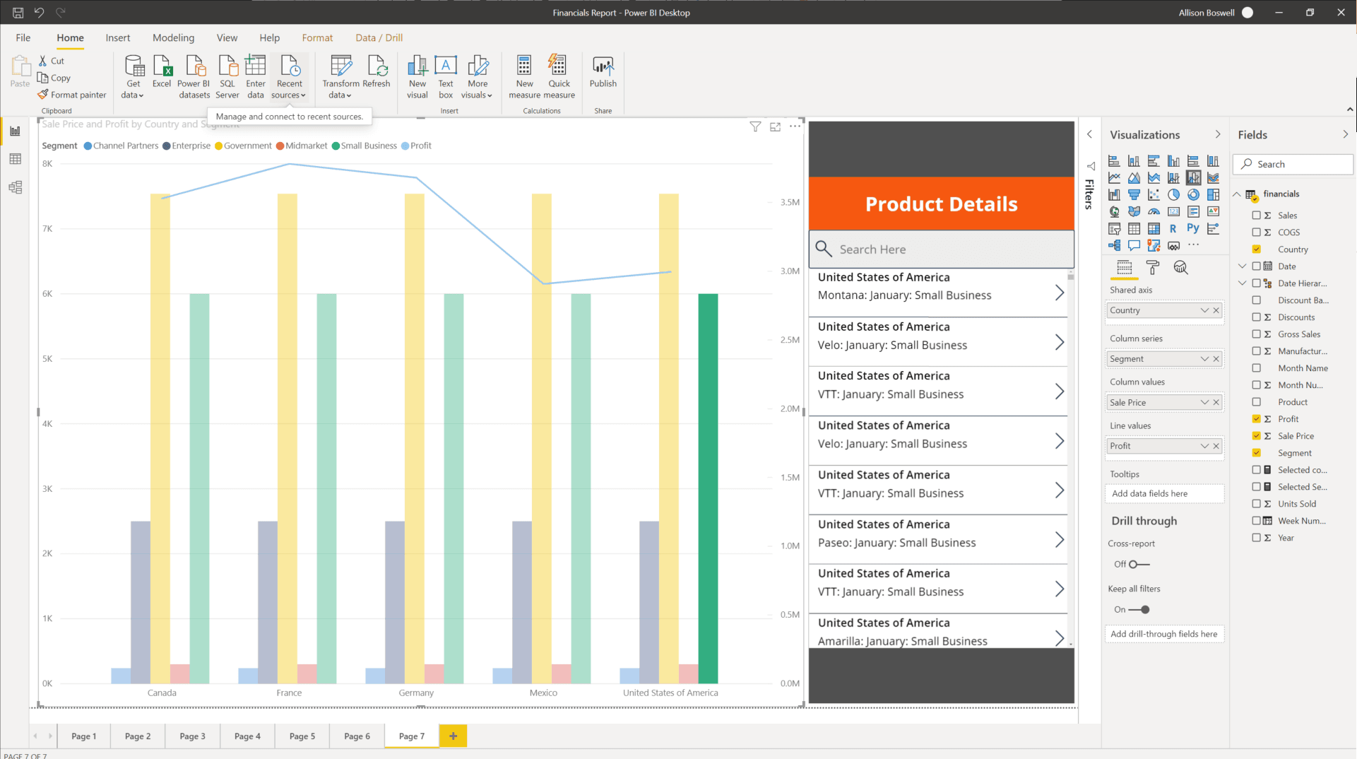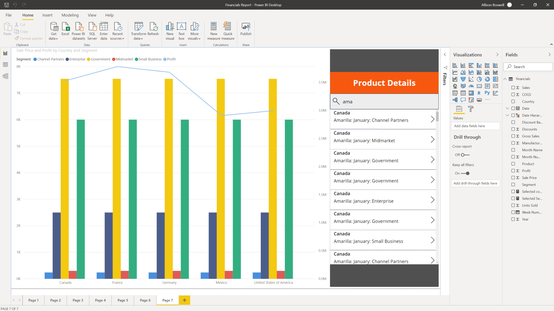 In the example below, we are analyzing the Sale Price and Profit by Country and Segment. Notice once you have embedded your Power App in a Power BI Dashboard you can navigate between screens.
