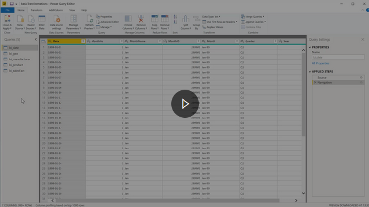 To begin, select Transform from the Navigator window to launch Power Query Editor. You can also launch Power Query Editor directly from Power BI Desktop by using the Transform data button on the Home ribbon.