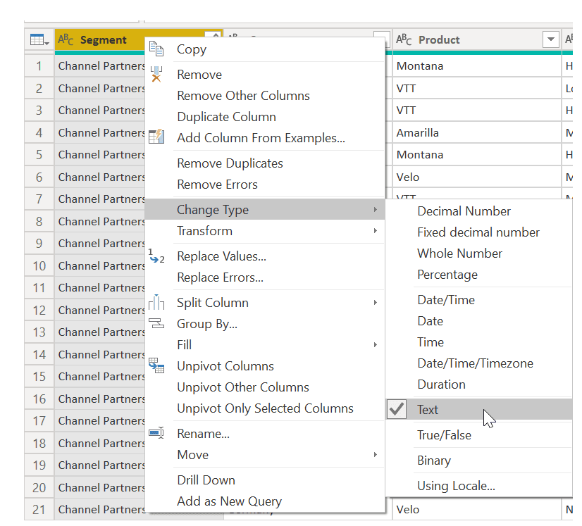 On the centre pane, right-clicking a column displays the available transformations. Examples of the available transformations include removing a column from the table, duplicating the column under a new name, or replacing values. From this menu, you can also split text columns into multiples by common delimiters.